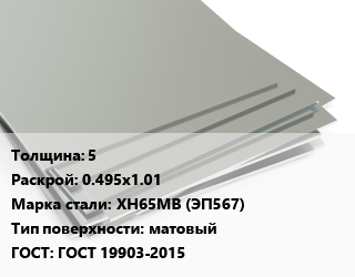 Лист нержавеющий 5 0.495х1.01 Сталь: ХН65МВ (ЭП567) Тип:матовый ГОСТ 19903-2015
