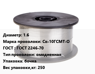 Проволока сварочная 1.6 Сталь: Св-10ГСМТ-О ГОСТ: ГОСТ 2246-70 омедненная бочка 250