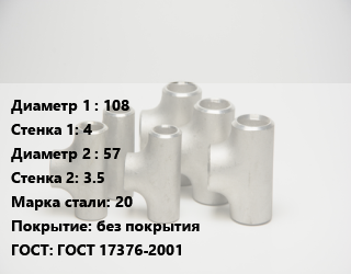 Тройник стальной 108х4 -57х3.5 Сталь: 20 без покрытия ГОСТ: ГОСТ 17376-2001