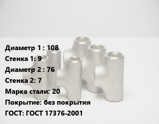 Тройник стальной 108х9 -76х7 Сталь: 20 без покрытия ГОСТ: ГОСТ 17376-2001